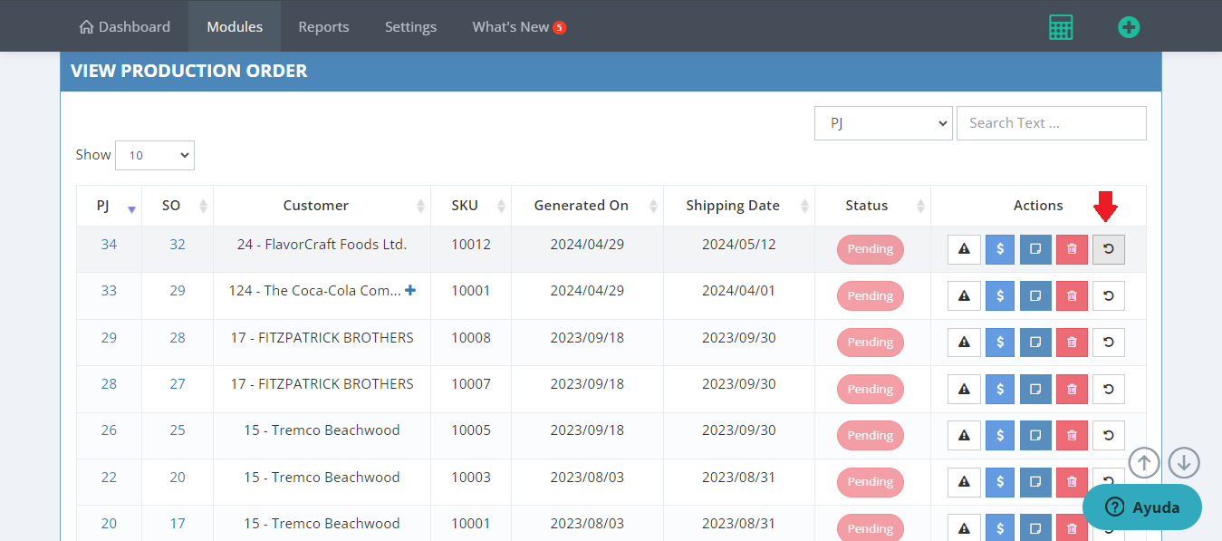 - Locate the 'undo' icon, which is situated to the right of each production order (OP). Note that this option is only available for production orders that have not had materials assigned and have not been dispatched.