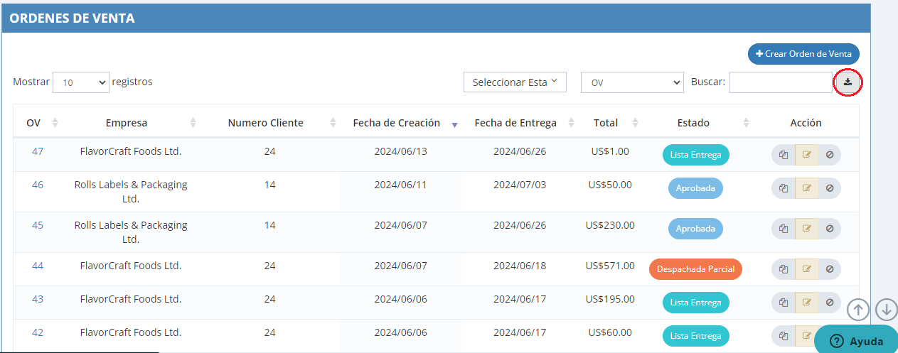 Para exportar la lista de órdenes de venta a CSV se debe hacer clic en el siguiente icono: