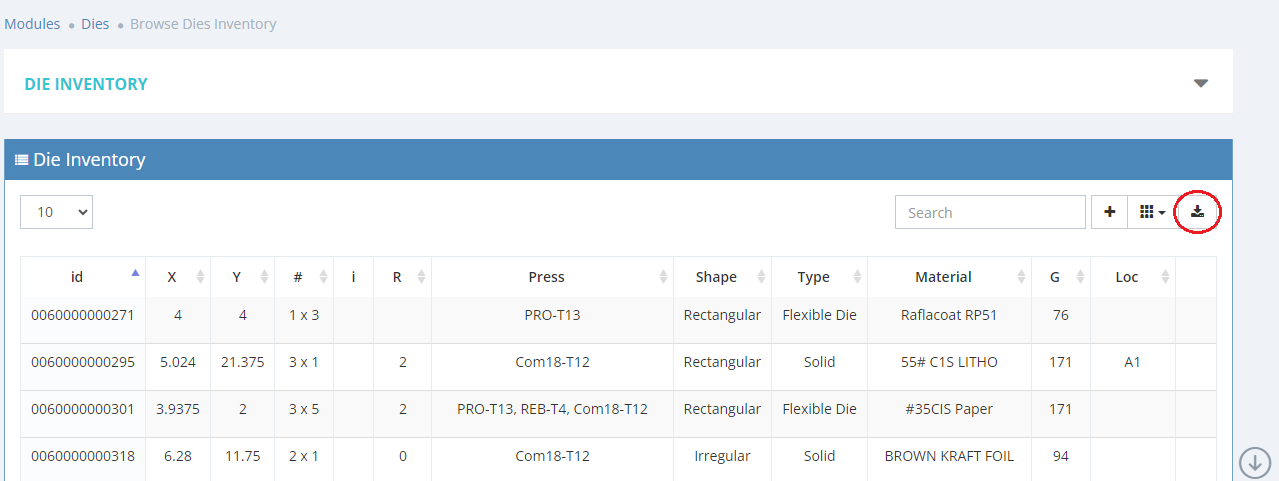 Inside the dies inventory click on the download icon to export the CSV file.
