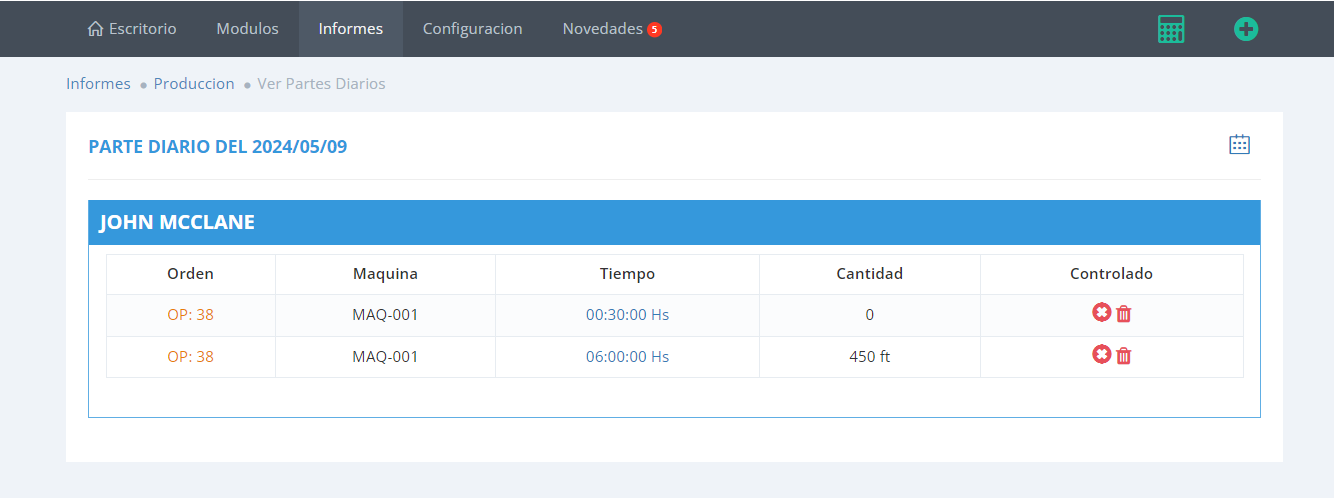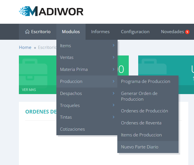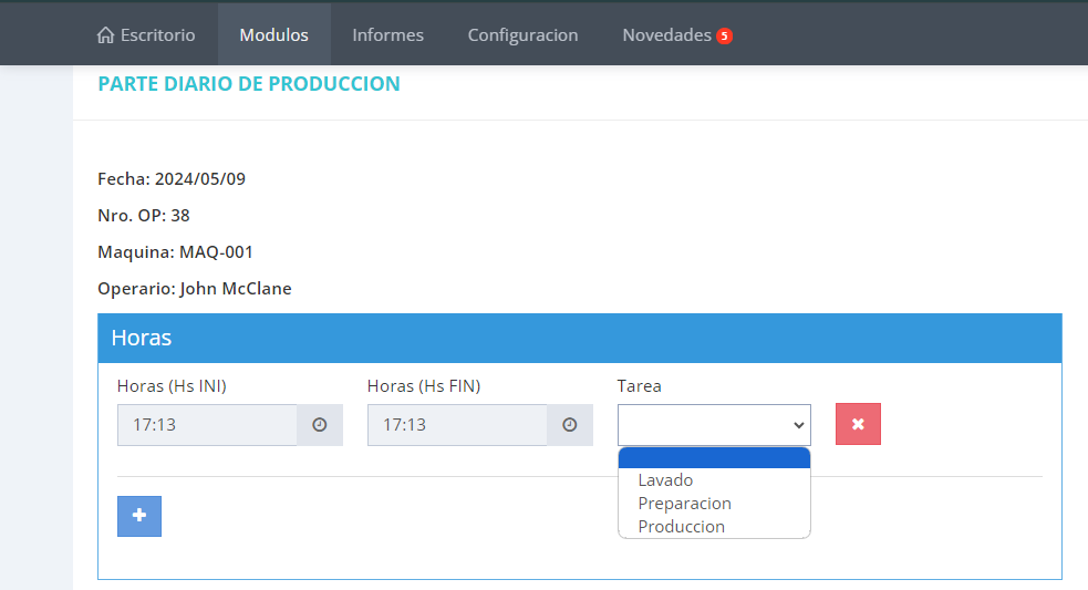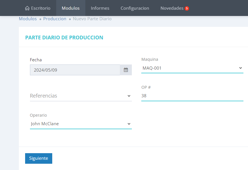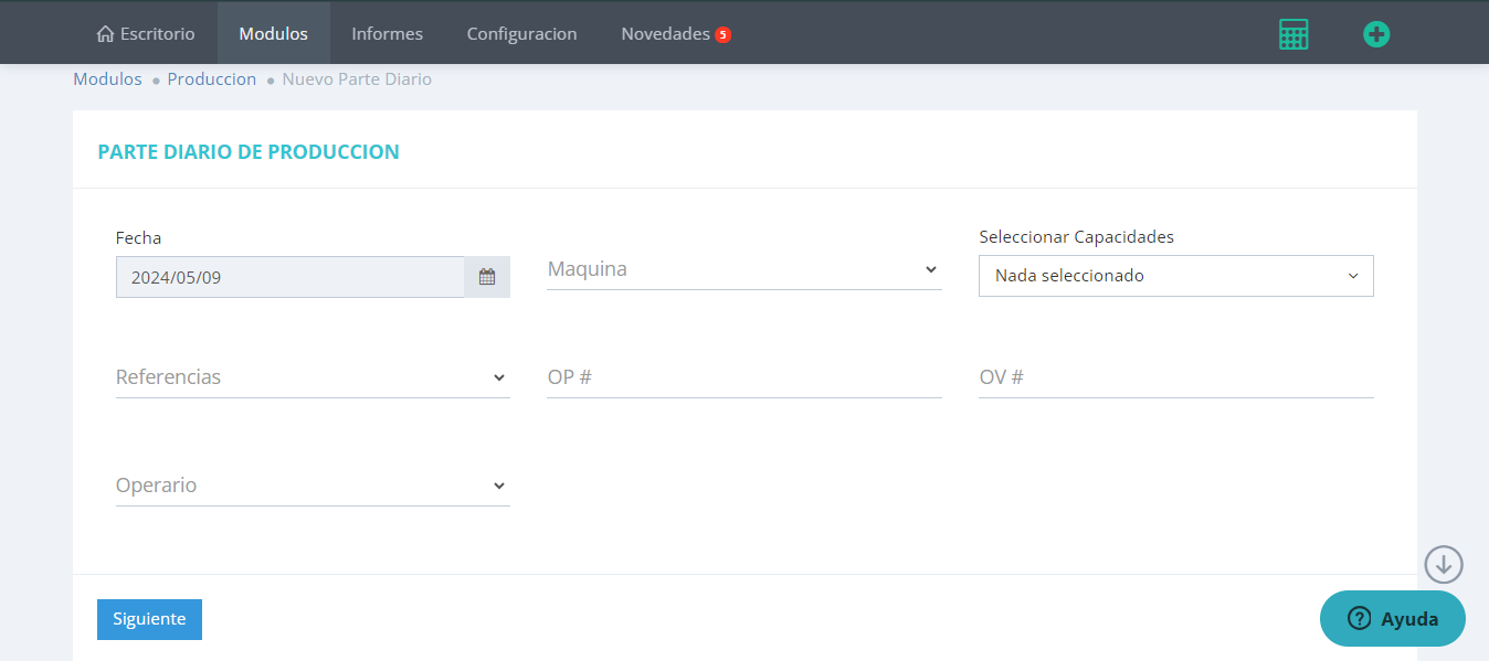 Ir a Módulos > Producción > Nuevo Parte Diario