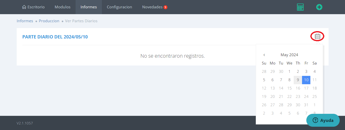 Una vez dentro, hacer clic en el icono de calendario para buscar la fecha correspondiente a los partes diarios que necesitamos visualizar.