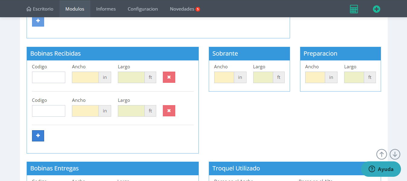 Este campo se habilita si anteriormente se ha elegido una máquina del tipo equipo de terminación y representa el largo de cada rollo a utilizar.