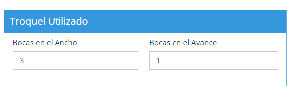 Aquí se indican las bocas de ancho y avance del troquel que utilice la máquina. Estos campos vienen completados con un troquel asignado a la máquina seleccionada.